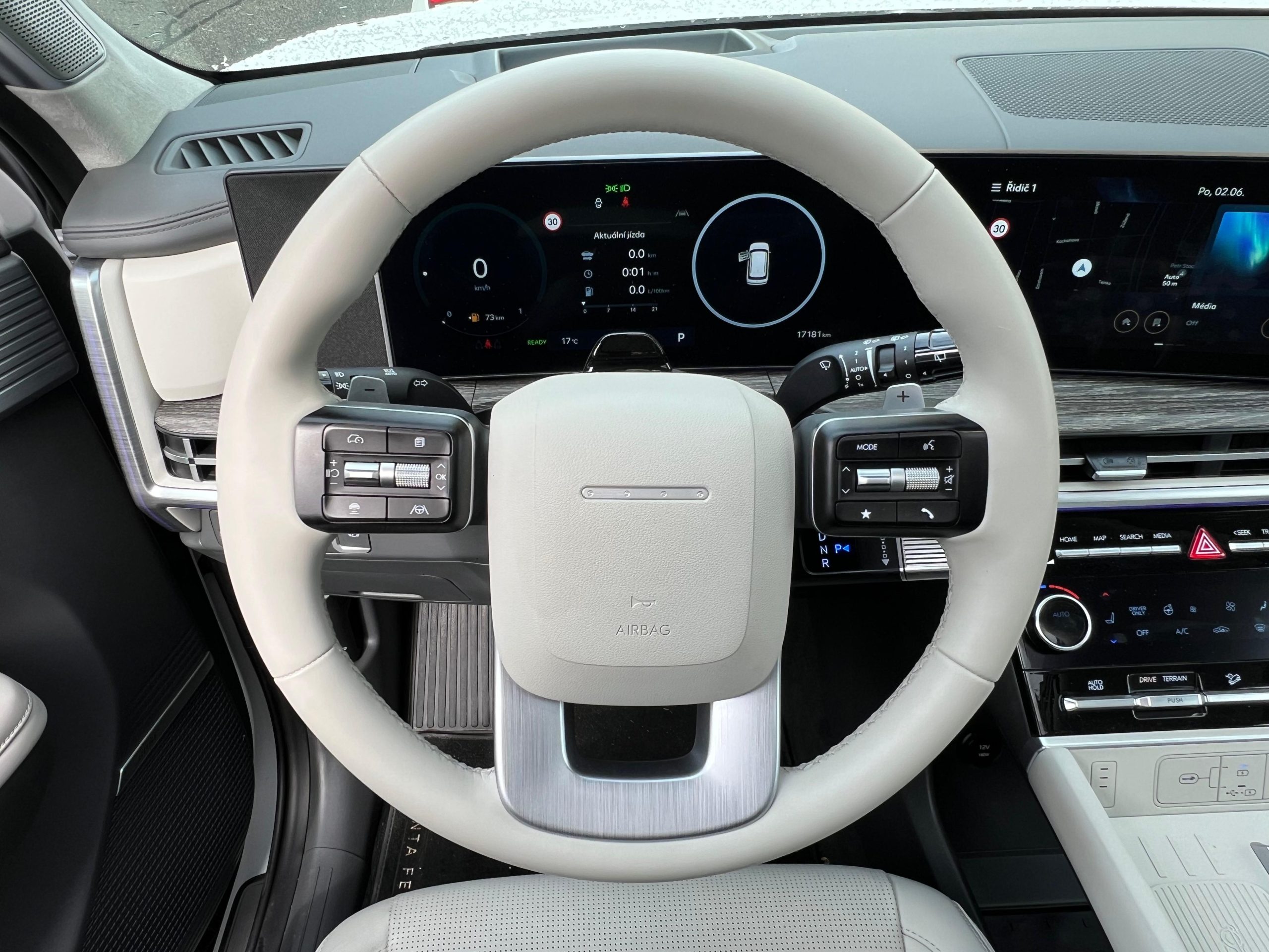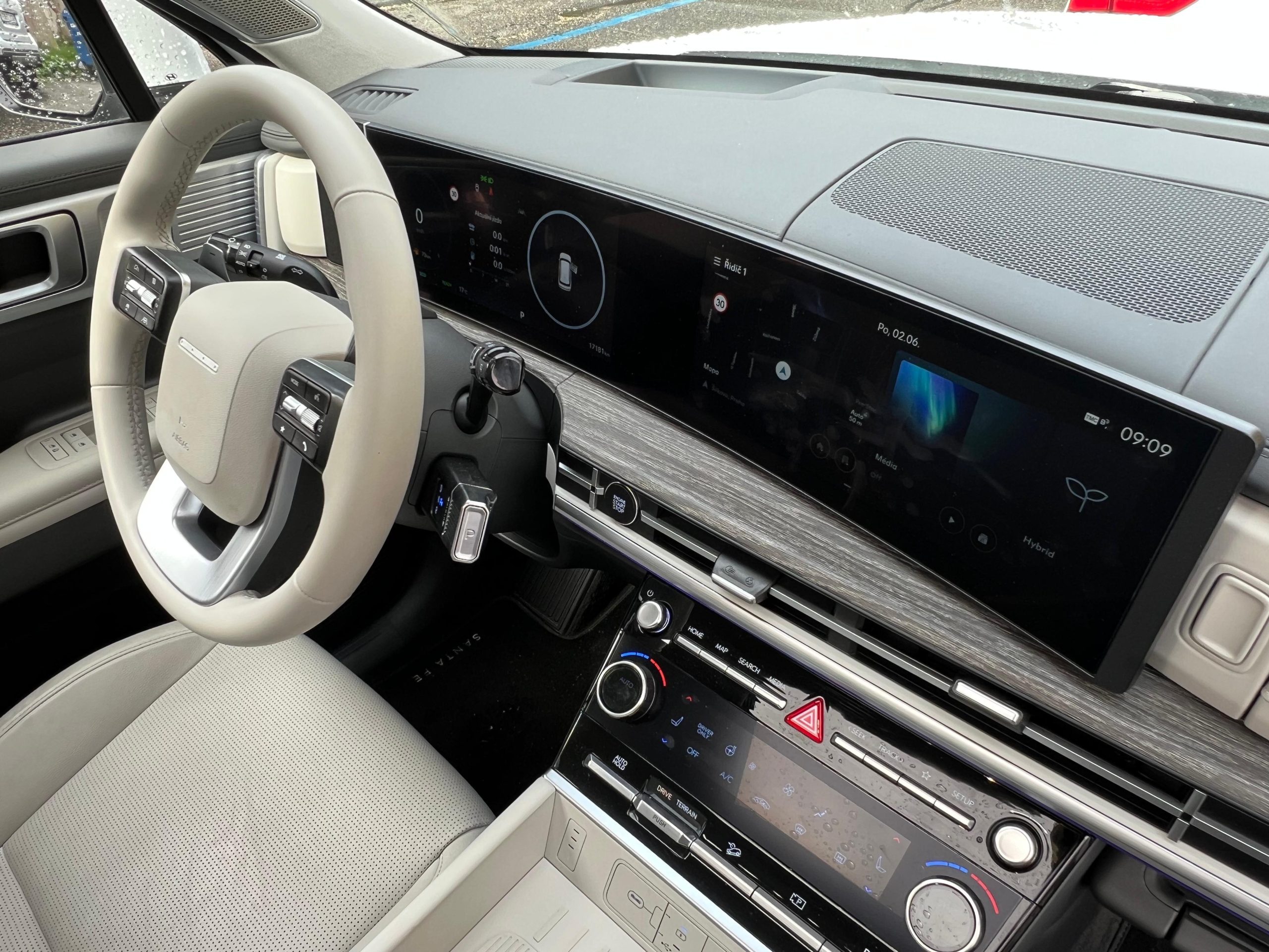 A tady se dostáváme k tomu, co dělá Santa Fe tak pohodlným parťákem na cestách. Palubní desce dominují dvě velké 12,3palcové obrazovky – jedna slouží jako přístrojový štít, druhá jako centrální infotainment. Všechno působí přehledně a moderně, žádné blikající disco. A když se setmí, grafika displejů vypadá fakt dobře – skoro jako byste seděli v kokpitu nějaké chytré rakety. Co mě ale fakt potěšilo, jsou klasická tlačítka. Jsou tam, kde je čekáte, chytře rozmístěná a hlavně – hned je najdete. Žádné složité hledání v menu. Ovládání klimatizace, sedaček nebo hlasitosti je rychlé, jasné a intuitivní. Tak to má být – dotykovky jsou fajn, ale fyzické čudlíky zkrátka mají něco do sebe. To je ovšem jen můj názor a chápu i ty, kteří mají raději moderní dotykové obrazovky.